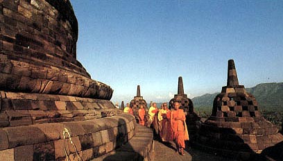 The Borobodur Temple complex is one of the greatest monuments in the world. It is of uncertain age, but thought to have been built between the end of the seventh and beginning of the eighth century A.D. For about a century and a half it was the spiritual centre of Buddhism in Java, then it was lost until its rediscovery in the eighteenth century.