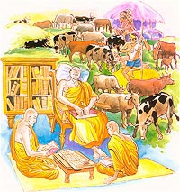 Explanation: Some persons may know the words of the Buddha extensively and can repeat it all. But through utter neglect they do not live up to it. In consequence they do not reach any religions attainments. They do not enjoy the fruit of the recluse life. This is exactly like the way of life of a cowherd who looks after another’s cattle. The cowherd takes the cattle to the pastures in the morning, and in the evening he takes them back to the owner’s house. He gets only the wages.