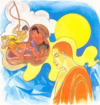 Explanation: The swans fly away in the sky – as the path of the sun. Those possessing psychic power travel through the sky. Those diligent, wise saint conquer death with his armies and leave the world and reach Nibbana.